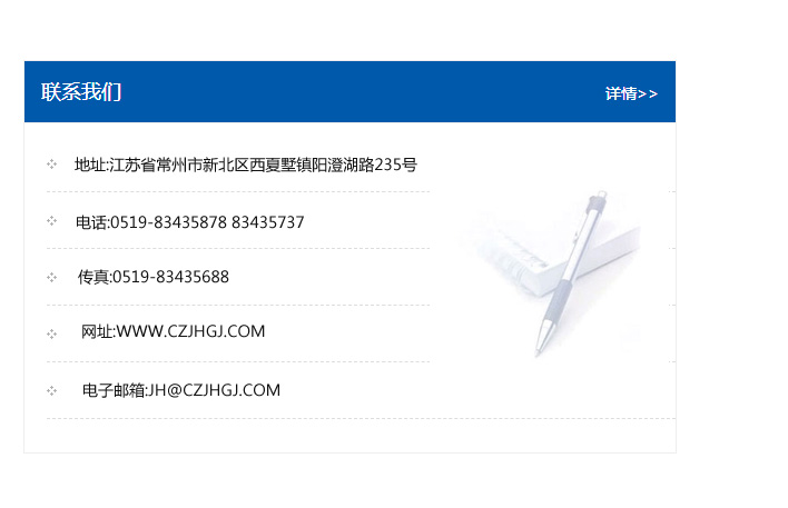 地址:常州市新北區友邦商務大廈1幢16、17層  電話:0519-85101652  傳真:0519-85112595  郵編:213022  網址:www.cz-jiayue_cn.kstengye.com  郵箱:xiajifengaa@163.com